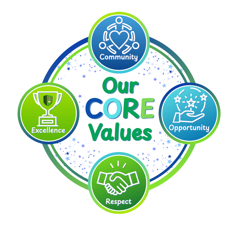 Our Core ValuesThese embody our belief that our school community should be at the heart of all we do. We should act with respect and kindness. We strive for excellence in all we do and enjoy all the opportunities provided. |